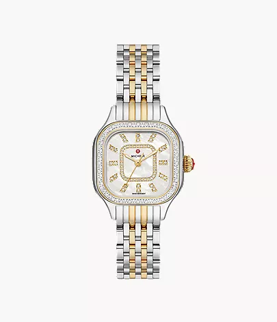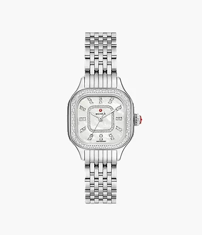 Elegant curves add modern elegance to the case of MICHELE's stunning Meggie watch that sparkles with 64 hand-set diamonds on the top ring in our signature MW pattern and a mother-of-pearl dial with diamond inner ring and signature double diamond indexes. This watch features a Swiss movement and a gleaming 14mm seven-link stainless steel bracelet made specifically for the Meggie collection interchangeable with any 14mm MICHELE strap.