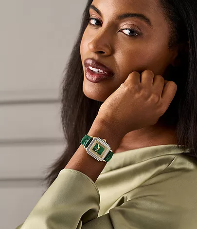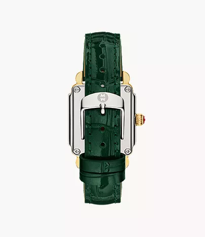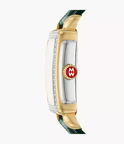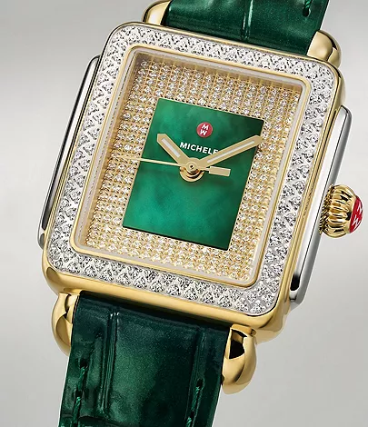 Elevate your style with this Special Edition Deco Madison Diamond Pavé Dial watch. Designed for the modern woman, this two-tone 18K gold-plated rectangular timepiece dazzles with its lush green mother-of-pearl dial surrounded by 306 diamonds on the dial and case (0.92 carat weight) and a Swiss movement. The shiny, croco-embossed leather strap gives it the finishing touch and is interchangeable with any 16mm strap from MICHELE's collection.